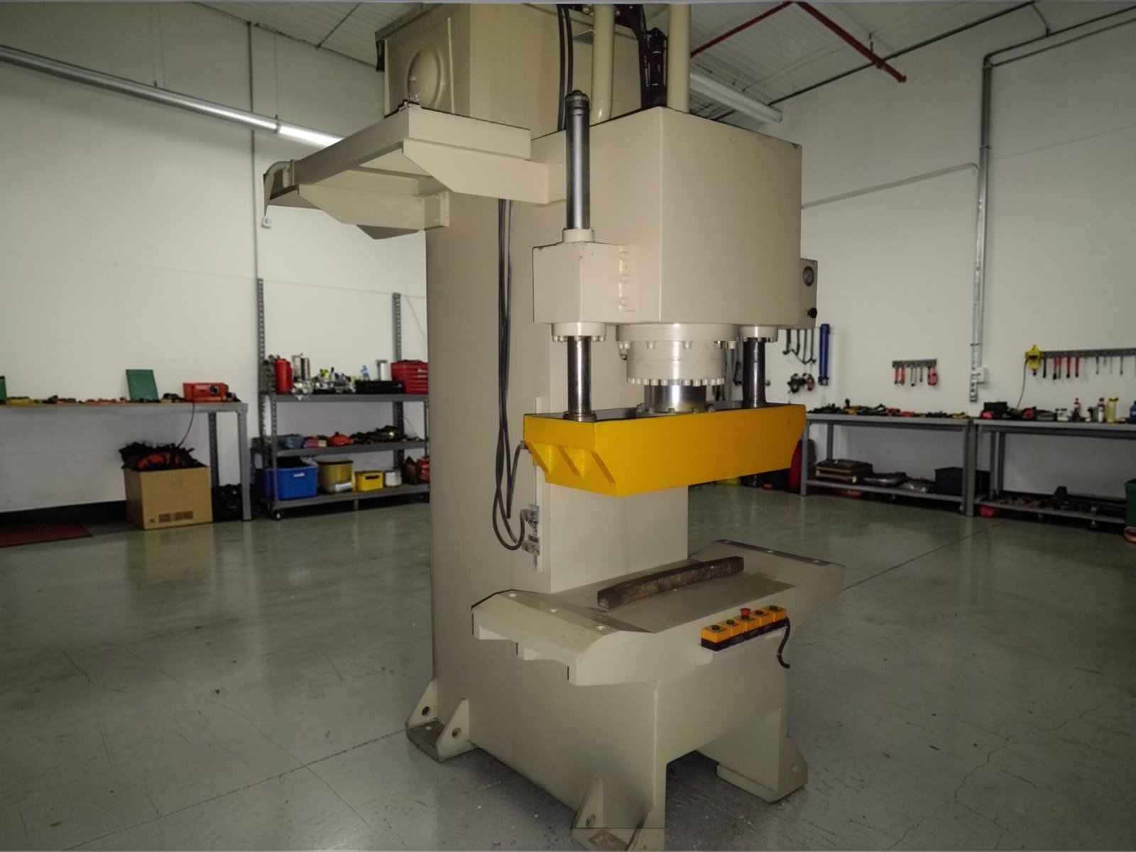 Mesin press hidrolik dengan desain rangka terbuka seperti huruf “C” yang memberikan akses 3 sisi untuk kemudahan feeding material. Ideal untuk punching, marking, straightening, dan assembly ringan dengan produktivitas tinggi.