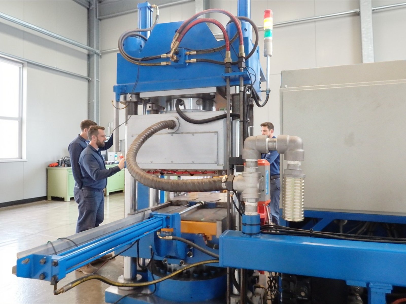 Mesin press hidrolik dengan pemanas yang digunakan untuk mengubah compound karet mentah menjadi produk jadi melalui proses vulkanisasi. Menggabungkan tekanan dan panas untuk menghasilkan produk karet dengan elastisitas dan kekuatan optimal.